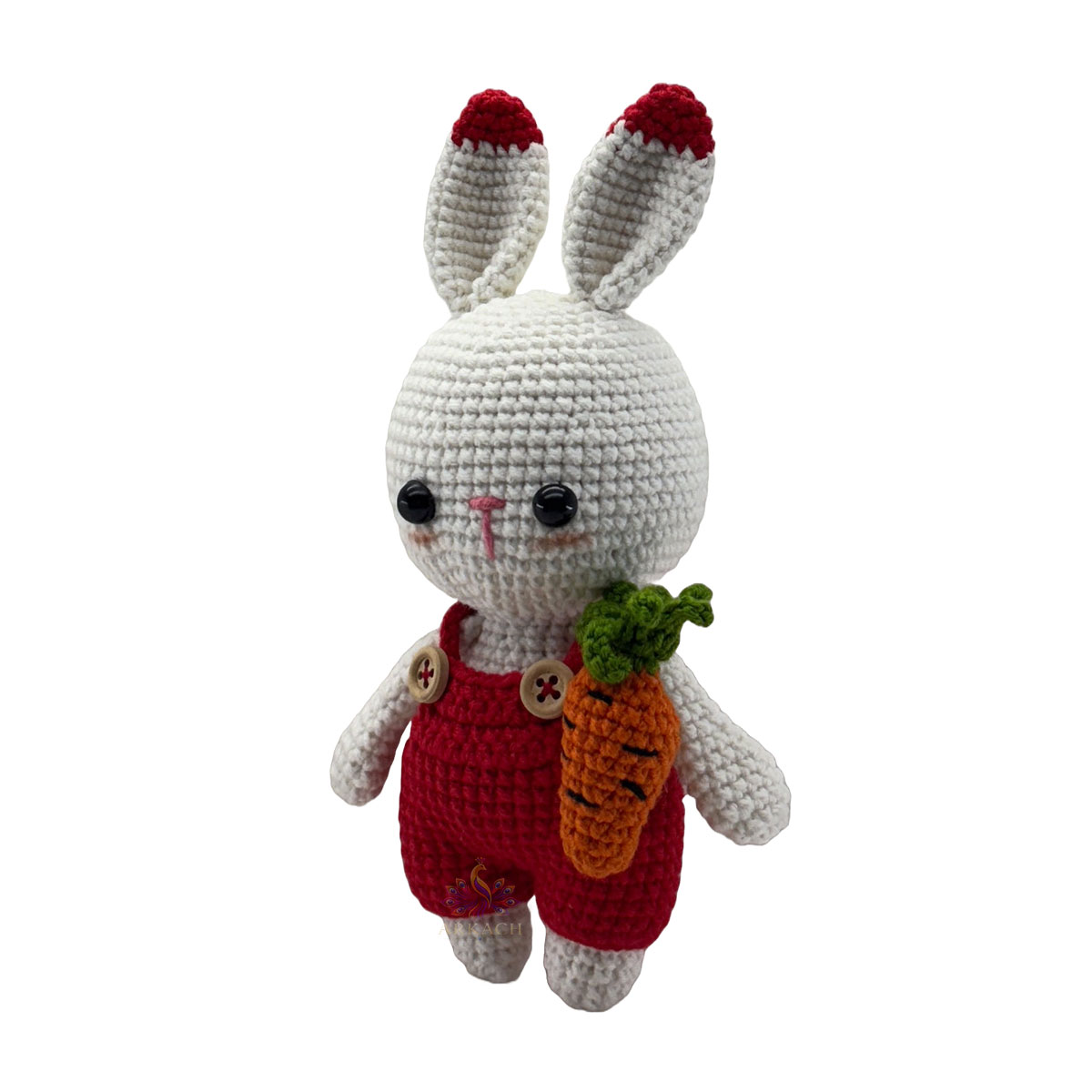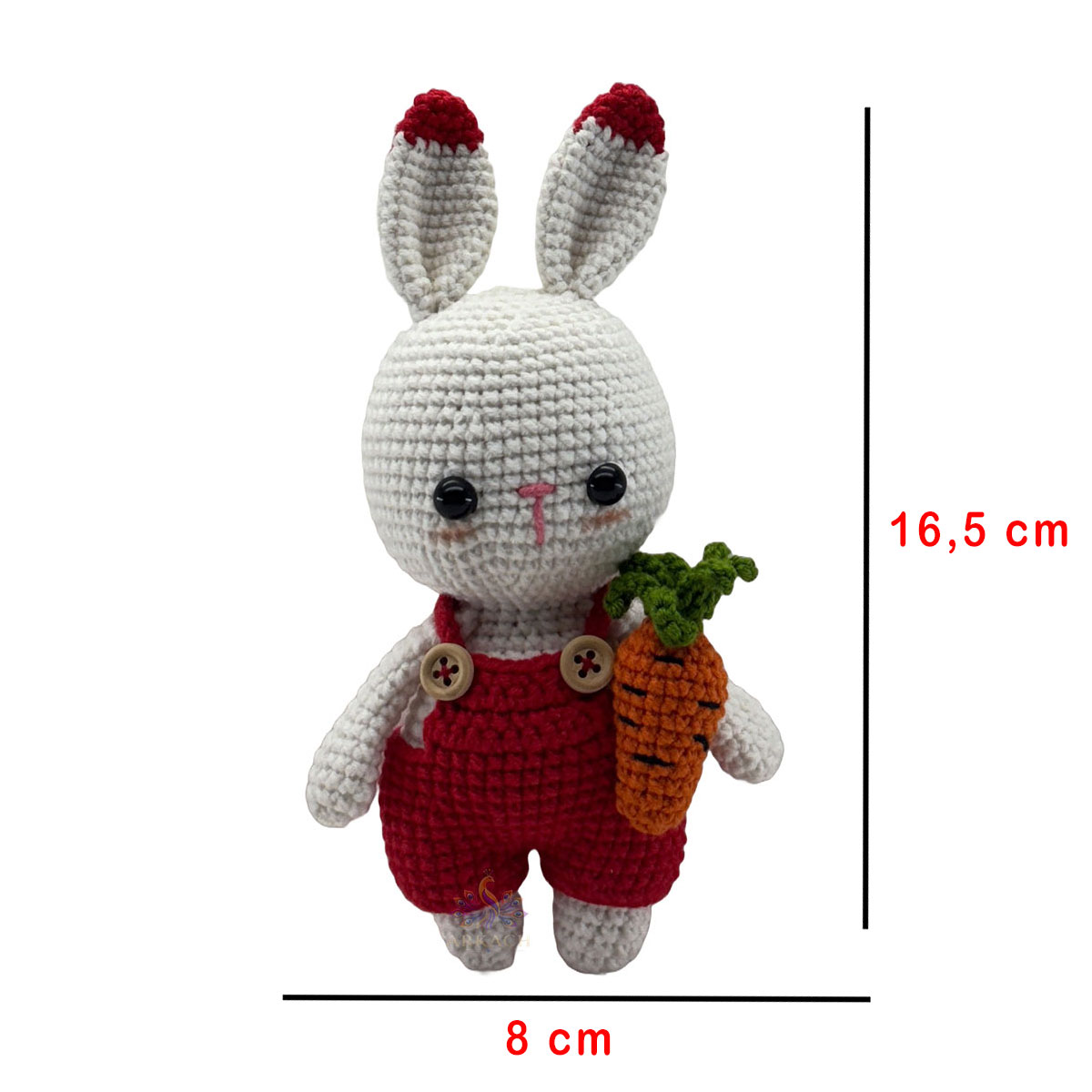 Kırmızı tulumu ve beyaz kulaklarıyla öne çıkan, %100 organik pamuk el örgüsü, şık kutusunda gönderilmeye uygun hediyelik amigurumi tavşan bebek.